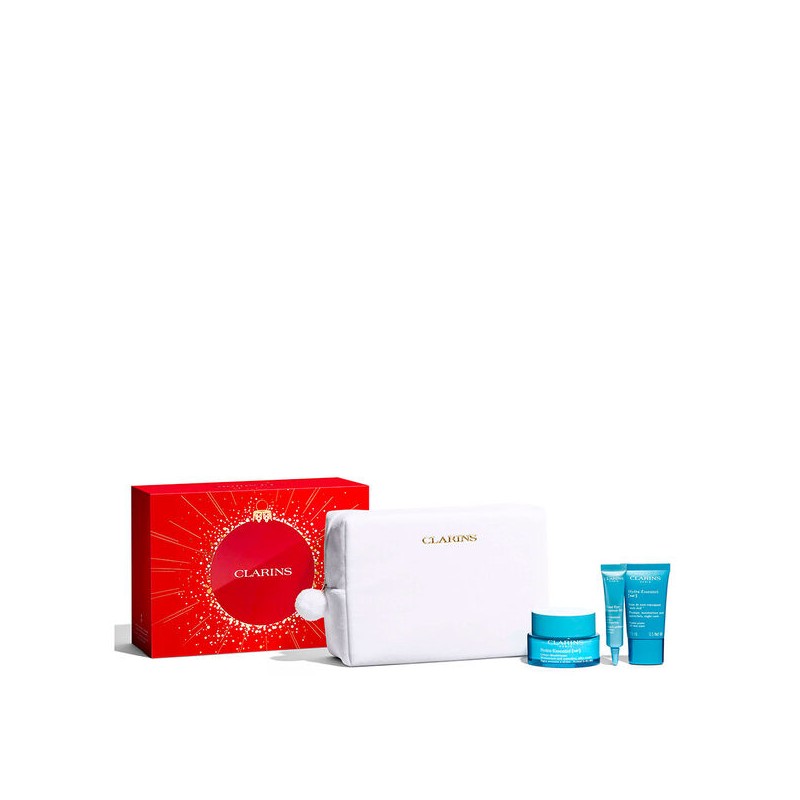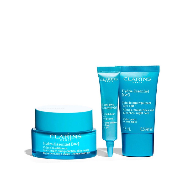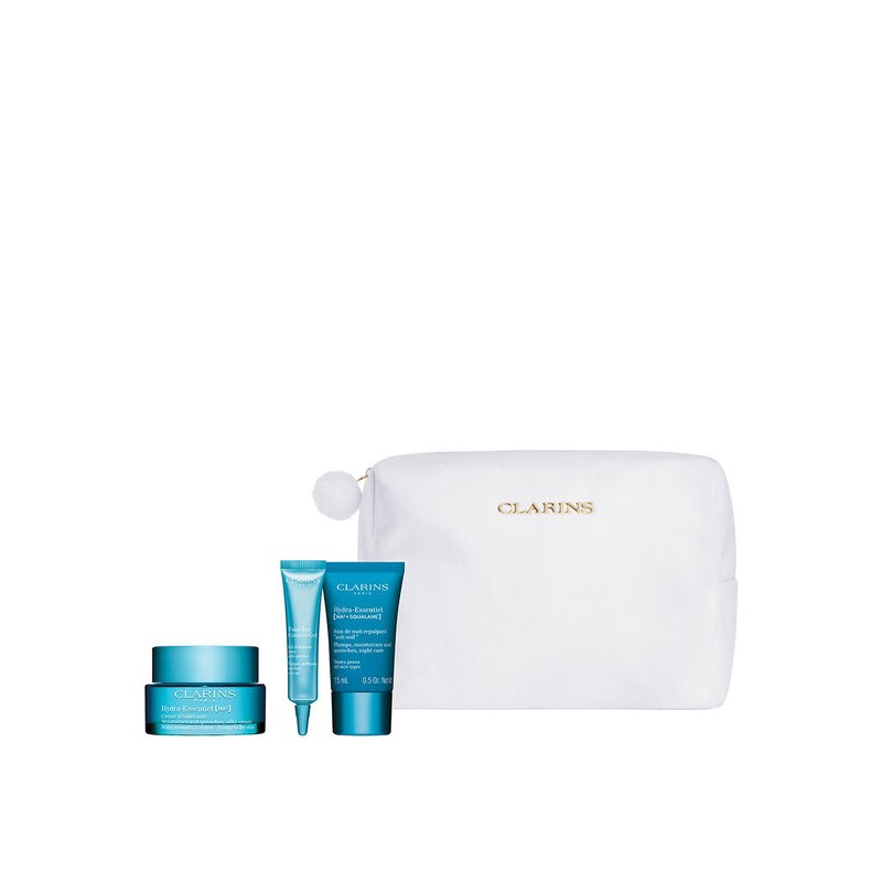 Ce coffret contient le soin Hydra-Essentiel Crème Désaltérante en 50 ml et en cadeau le Soin de Nuit Repulpant en 15 ml et le soin Total Eye contour des yeux en 7 ml dans une jolie trousse Clarins.