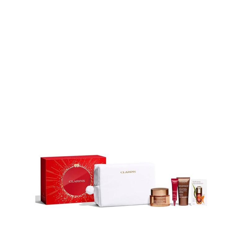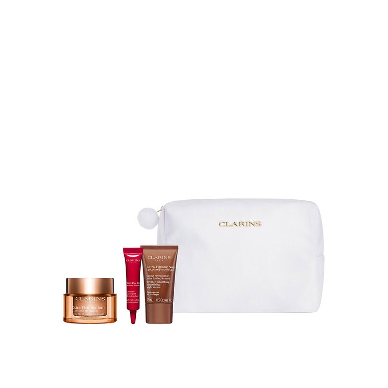 Ce coffret contient le soin Extra-Firming Jour toutes peaux en 50 ml et en cadeau le soin Extra-Firming Nuit en 15 ml et le Total Eye Lift en 7 ml dans une jolie trousse Clarins.