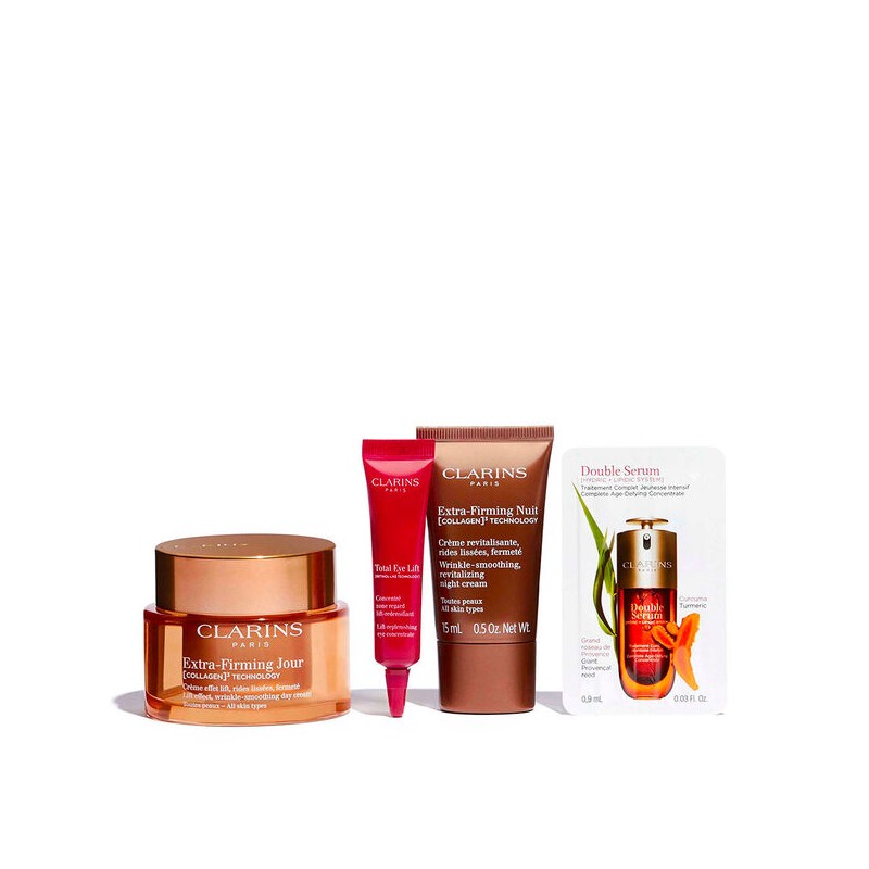 Ce coffret expert est idéal pour les femmes qui veulent une peau d'apparence plus jeune, plus lisse, raffermie, comme liftée : appliquez chaque jour la crème Extra-Firming Jour, dont la nouvelle technologie [COLLAGEN]3 TECHNOLOGY (polypeptide de collagène + extrait de pacanier + extrait de mitracarpus ) aide à améliorer la fermeté de la peau. Complétez votre routine soin avec la Crème Extra-Firming Nuit, qui va agir pendant les heures les plus propices à la régénération de la peau. Et pour un contour des yeux raffermi, le nouveau soin Total Eye Lift contribue à un regard éclatant de jeunesse. A combiner avec l'iconique Double Serum nouvelle génération, traitement complet pour cibler les signes de l'âge.