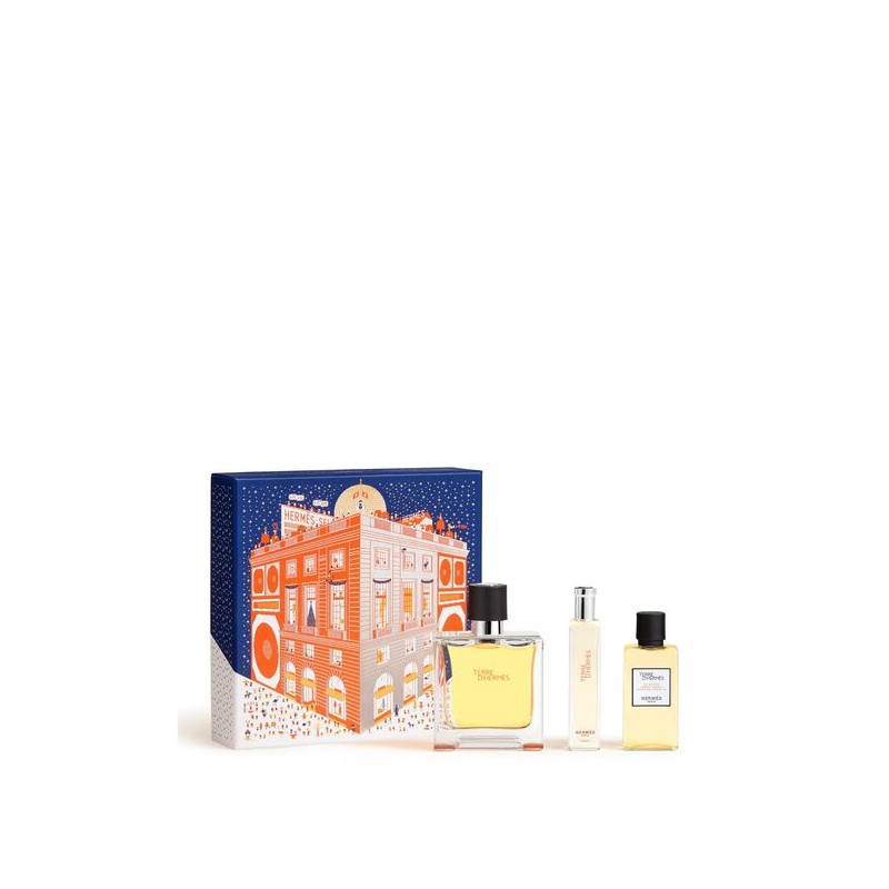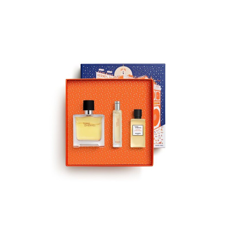 Ce coffret contient le Parfum Terre d'Hermès en vaporisateur 75 ml et en cadeau le vaporisateur nomade Terre Parfum en 15 ml et le gel douche corps et cheveux en 40 ml.