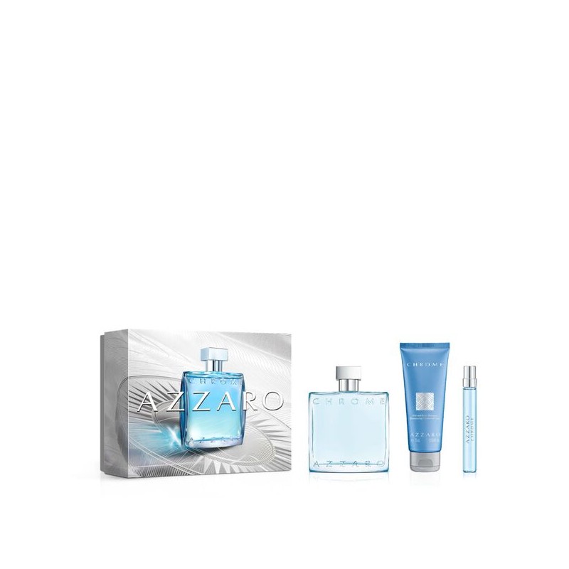 Ce coffret contient l'eau de toilette Chrome en vaporisateur 100 ml et en cadeau le shampooing douche en 75 ml et un vapo nomade en 10 ml.